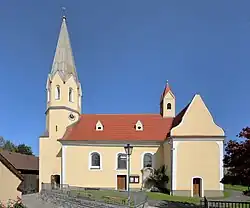 Der barocke im Kern mittelalterliche Kirchenbau hat einen vorgestellten Westturm.