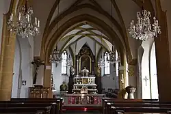 Dem dreijochigen Langhaus mit eingezogenem Triumphbogen schließt ein einjochiger spätgotischer Chor mit 5/8-Schluss an. Langhaus und Chor haben ein Netzrippengewölbe. Im Langhaus sind die Schlusssteine in Wappenschildform, im mittleren Joch ist ein Heiliggeistloch. In den Langhauswänden sind romanischen Mauerteile erhalten. Um 1670 wurde seitlich des östlichen Langhausjoches je eine einjochige kreuzgratgewölbte Kapelle angebaut. Der fünfgeschoßige Turm ist westlich des Langhauses leicht in die Fassade hineingestellt. Er hat im zweiten Obergeschoß romanische Fenster. Das oberste Turmgeschoß ist achtseitig, hat ein verkröpftes, geschwungenes Abschlussgesims, und darüber einen reichen Zwiebelhelm mit Laterne. Die barocke, stichkappentonnengewölbte Sakristei ist nördlich des Chores angebaut und hat im Obergeschoß ein Oratorium. Bei der Restaurierung von 1975 bis 1976 wurden beim Bau der Kirche eingebaute Römersteine aus dem 2. Jahrhundert freigelegt und figürliche Römersteine an der Südwand der Kirche frei eingebaut.