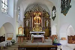Die Kirche, die in Verbindung mit der Rosalienkapelle eine viel besuchte Wallfahrtsstätte ist, hat einen barocken Hochaltar. In dessen Mittelpunkt steht eine aus dem 15. Jahrhundert stammende gotische Madonna mit auf dem Arm liegenden Jesukind. Der Legende nach ist diese Statue bei Bränden und anderen Zerstörungen immer unversehrt geblieben.[1][2][3]