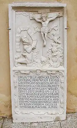 Der Grabstein des Ritters Wolf Geysenhausen wurde im Jahr 1935 von der Wand beim Haupteingang unter dem Chor zunächst an die Mauer zwischen Beichtstuhl und Seitenaltar versetzt und wenig später an der Außenmauer des Chores neben den Priestergräbern angebracht.