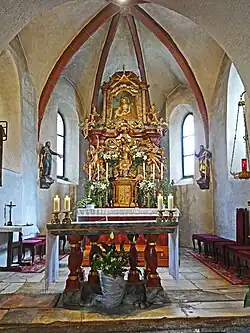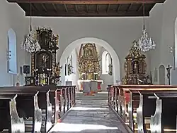 Der Hochaltar entstand im dritten Viertel des 18. Jahrhunderts. Die zentrale Statue zeigt den hl. Jakobus, die beiden flankierenden Engel erinnern in Dynamik und Gestik an Engel von Ignatz Günther. Im Aufsatzbild ist die hl. Anna mit Maria als Kind zu sehen. Der linke Seitenaltar aus dem dritten Viertel des 17. Jahrhunderts stand ursprünglich in der Pfarrkirche Zweinitz und besteht aus einer Ädikula mit seitlichen Konsolfiguren auf einem kleinen Sockel und einem gesprengten Segmentgiebel mit kleiner Ädikula als Aufsatz. Die gedrehten Säulen sind mit Weinlaub geschmückt. Auf dem Altar steht eine Schöne Madonna von 1425/1430 sowie die Figuren der Heiligen Katharina und Josef. Das Aufsatzbild zeigt die Taufe Jesu. Der rechte Seitenaltar entstand um 1720/1730. Im Schrein steht eine Figur des hl. Florian. Die Figuren der vier Evangelisten aus dem 18. Jahrhundert auf der Emporenbrüstung stammen von der ehemaligen Kanzel. An der Nordwand hängt ein qualitätsvolles Kruzifix aus dem 17. Jahrhundert.