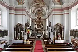Der dreijochige Saalraum und der eingezogene, zweijochige Chor sind überwölbt von Flachtonnen mit Stichkappen und Gurtbögen, die auf einem horizontal durchlaufenden, stark profilierten Gesims liegen und von mächtigen Pilastern getragen werden. Die ornamentale Glasmalerei ist aus dem Jahre 1895. Die barockisierenden Deckenfresken von 1955 schuf der Maler Wolfram Köberl. Über den Türen zu den beidseitigen Choremporen sind 1955 freigelegte Rundmedaillons mit Fresken der hl. Leopold und Nikolaus aus dem Jahre 1820 erhalten.