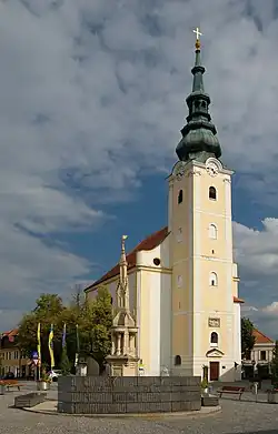 Die stattliche barocke Pfarrkirche hat einen im Kern mittelalterlichen Westturm. Die Kirche hat ein annähernd quadratisches Langhaus und einen schmäleren, langen Chor mit einer flach abgerundeten Apsis. Der mächtige, viergeschoßige Westturm mit dem Hauptportal und der Eingangshalle steht vor der Westfassade. Er trägt eine vereinfachte barocke Gliederung. 1885 wurde er zu seiner heutigen Höhe ausgebaut und erhielt einen mehrfach geschwungenen, reich profilierten Zwiebelhelm. Über dem Hauptportal mit Dreiecksgiebel ist ein steinernes Wappen der Sinzendorf aus der 1. Hälfte des 17. Jahrhunderts in die Wand eingelassen.