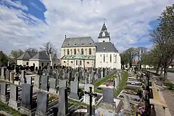 Von der ursprünglichen Kirche ist nur mehr der wuchtige Wehrturm und das Presbyterium, vermutlich Ende des 14. Jahrhunderts[3] /Anfang des 15. Jahrhunderts,[4] erhalten. 1892 gründete sich ein Kirchenbaukomitee zur Erweiterung der Kirche.[4] Ab 1897 erfolgte der Umbau nach den Plänen des Architekten Eugen Schweigl (1842–1929)[5], bei dem das alte Langhaus abgetragen und durch ein neues, größeres ersetzt wurde. Im Zuge dieses Umbaus, der mit der Weihe am 22. Dezember 1901 abgeschlossen war, wurde auch die unter Denkmalschutz stehende Aufbahrungshalle, südwestlich der Kirche, errichtet.[3]