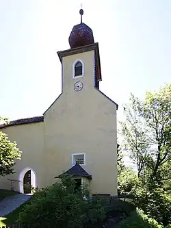 Der nach Südosten gerichtete Kirchenbau hat nördlich an der Hofseite einen Kapellenanbau. Über der nordwestlichen Giebelfront erhebt sich der Dachreiter mit einem Zwiebelhelm.