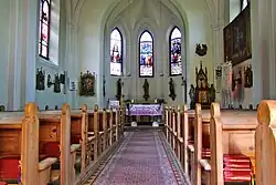 Die neugotische Inneneinrichtung stammt zum Großteil aus der Zeit um die Jahrhundertwende (Erbauungszeit). 1977 wurde ein Volksaltar aus einem Teil des ursprünglichen Hochaltares errichtet, der ursprüngliche Mittelteil ist heute das Sakramentshäuschen auf der rechten Seite der Kirche.