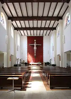 Im Zweiten Weltkrieg wurde die Vorgängerkirche durch einen Bombenangriff am 24. Mai 1944 völlig zerstört. In den Jahren 1949 bis 1952 wurde nach den Plänen von Architekt Josef Vytiska eine Kirche mit einem breiten hohen Langhaus, einem mächtigen Satteldach und der Kirchturm errichtet. Die Hauptportalfassade mit Dreiecksgiebel und Säulen zeigt ein Sgraffito Christkönig von Karl Hauk, der auch umfangreichen Glasmalereien, Mosaike und den Kreuzweg gestaltet hat. Die dreischiffige Basilika hat ein breites Mittelschiff mit Holzbalkendecke auf Betonpfeilern mit einer stützenfreien Orgelempore. Beim Hochaltar ist ein großes Kruzifix von Gustav Resatz. Es ist das größte Kreuz Österreichs in einem Innenraum.