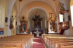 Das Kircheninnere zeigt ein vierjochiges barockes Langhaus mit Pilastergliederung, breiten Gurtbögen und Kreuzgewölben mit Stuckmedaillons aus 1679. Die zweigeschoßige dreiachsige Empore aus 1794 steht auf Pfeilern und zeigt zum Langhaus Rundbögen. Der eingezogene Triumphbogen ist rundbogig. Der zweijochige Chor mit einem dreiseitigen Schluss hat eine Pilastergliederung und ein Kreuzgewölbe, links mit einem Portal zu einer Kammer und rechts mit dem Portal zur Sakristei.