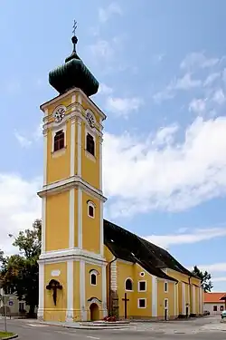 Die im Kern romanische Kirche wurde gotisch neu errichtet. Beim spätgotischen Umbau wurde der Westturm entfernt und das Langhaus um ein Emporenjoch verlängert, weiters neben dem Chor eine Kreuzkapelle angebaut und der Turm als Ostturm am Haupt des Chores neu errichtet.
