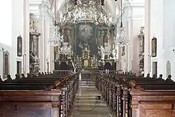 Der Hochaltar aus 1713 nach einem Entwurf und mit einem Altarbild von Hans Michael Beckhl entstand mit den Bildhauern Mathias Roth und Jeremias Weißkopf.