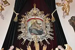 Den Hochaltar mit einem vorspringenden Säulenaufbau und Figurenschmuck baute 1753 Franz Domiscus. Der Seitenaltar zeigt das Bild der Mariahilfer Maria nach Giovanni Pietro de Pomis in einem bemerkenswerten Metallrahmen aus der Mitte des 18. Jahrhunderts. Im linken Seitenarm wurde ein abgenommenes Fresko mit einer Kreuzigung aus dem 17. Jahrhundert neu situiert. Im rechten Seitenarm sind mehrere Konsolfiguren zu finden. Der Kreuzweg ist im Stil der Nazarener gemalt.