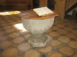 Der Taufstein aus Sandstein ist das älteste noch erhaltene Ausstattungsstück der Kirche und stammt aus dem späten 15. Jahrhundert. Der niedrige Sockel trägt ein polygonales Becken, in dessen Feldern Maßwerk, Pass und Fischblasenformen eingearbeitet sind.