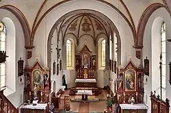 Der Hochaltar zeigt das Altarbild Herz Jesu von F. Walker und trägt die Figuren der Heiligen Vitus und Augustinus. Der linke Seitenaltar zeigt das Altarbild Maria mit Kind und Arme Seelen von F. Walker und die trägt die Figuren der Heiligen Monika und Elisabeth. Der rechte Seitenaltar zeigt das Altarbild Heilige Familie von B. Waltl und trägt die Figuren der Heiligen Michael und Raffael.