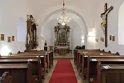 Zentrales Element der Kirche ist der barocke Hochaltar mit der Darstellung des heiligen Andreas. Er wird flankiert von Statuen des heiligen Leopold und des heiligen Florian. Die Darstellung des Heiligen Georgs stammt aus dem Jahre 1827 und wurde vom nazarenischen Maler Johann Stätter nach einer Skizze von Ludwig Ferdinand Schnorr von Carolsfeld gemalt. Rechts des Hochaltars befindet sich ein spätbarocker Marienaltar, der um 1760 geschaffen wurde. Die im Zentrum befindliche spätgotische Madonna stammt hingegen aus dem frühen 16. Jahrhundert. An der Südwand der Kirche findet sich ein großes, barockes Kruzifix, das von einem nicht mehr erhaltenen Kreuzaltar stammt. Dieser wurde 1732 an der nördlichen Außenwand angebracht, im 19. Jahrhundert jedoch entfernt. Weitere erwähnenswerte Elemente der Kirche sind ein gotischer Taufstein aus rotem Marmor (um 1500), ein Opferstock mit Rosettendekor, sowie ein muschelförmiges Weihwasserbecken (beides aus dem 17. Jahrhundert). Die Orgel baute 1849 Franz Ullmann.
