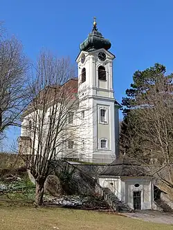 Urkundlich wurde 1624 eine Kapelle genannt. Die Kirche wurde von 1729 bis 1732 mit dem Architekten Jakob Öckl an der Stelle einer älteren Kapelle auf einem Plateau über dem barocken Brunnenhaus erbaut. 1783 wurde die Kirche zur Pfarrkirche erhoben.