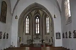 Nördlich zwischen zwei Strebepfeilern ist eine seicht vorragende Maria-Lourdes-Kapelle aus dem 17./18. Jahrhundert angebaut, bei der ursprünglich ein romanischer Baukern vermutet wird. Im Süden ist eine spätgotische Vorhalle angebaut, sowie eine Sakristei und ein Verbindungsraum (Beichtkapelle) zwischen den beiden.[7]