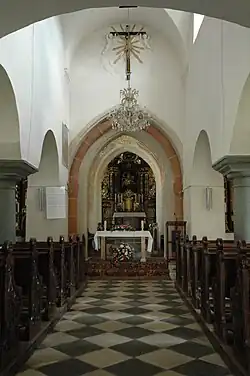 Das Kircheninnere zeigt ein dreischiffiges Langhaus, anfangs unter einer Flachdecke, mit gratigen Kreuzgewölben aus dem 17. Jahrhundert, die Raumtrennung erfolgt mit zwei massiven rechteckigen Pfeilern und zwei toskanischen Säulen, ähnlich wie im Erdgeschoß vom Schloss Keutschach, die Wandgliederung hat Pilaster zwischen Arkaden. Der spitzbogige frühgotische Triumphbogen hat 3/4-Säulenvorlagen und Würfelkapitelle und im Scheitel eine später aufgesetzte Rosette. Das Chorquadrat unter einem gratigen Kreuzgewölbe ist um zwei Stufen erhöht. Der zweijochige Chor ist um vier Stufen erhöht und unter einem Tonnengewölbe mit Stichkappen. Der Chorschluss hat ein Kreuzgewölbe mit Stukkatur von Kilian Pittner um 1731, auch die zwei barocken Kapellen, gestiftet von Graf Leopold Orsini-Rosenberg, zeigen vorzügliche Gewölbestukkaturen.