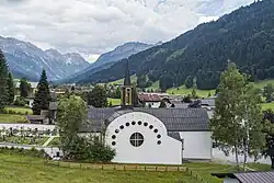 Der moderne Kirchenbau hat einen Zentralraum unter einer querliegenden Tonne über einem annähernd kreuzförmigen Grundriss, am Kreuzungspunkt befindet sich ein turmartiger Aufsatz. Die Westfront zeigt ein gekehltes gotisches Spitzbogenportal.
