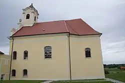 Der Zentralbau in der Grundform des Griechischen Kreuzes mit gerundeten Ecken hat eine westliche Hauptgiebelfassade mit Pilaster-Riesenordnung und einem geschweiften Giebel mit einem Fassadentürmchen mit ionischen Eckpilastern und Pyramidenhelm. Das quadratische Kirchenschiff ist platzlgewölbt mit breit geschwungener Kehle zum Emporen- und Chorjoch. Die Querarme des Schiffes sind tiefe Nischen unter Schildbögen. Die breite Empore hat eine vorgebauchte Brüstung. Der quadratische flach schließende Chor ist platzlgewölbt. Nördlich am Chor ist ein Oratorium im Stil des Rokoko angebaut.