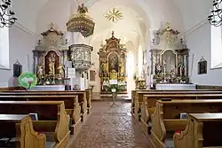Das Kircheninnere zeigt ein Langhaus unter einem Tonnengewölbe aus der Zeit um 1820 und einen eingezogenen Chor, ehemals wohl einjochig mit einem Fünfachtelschluss, die Rippen fehlen. Der südliche Anbau beinhaltet im Westen eine Priestergrabkapelle mit einem Kreuzgewölbe und im Osten eine Rundnische mit der barocken Figur des dornengekrönten Christus.