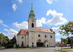 Die ursprünglich gotische Kirche wurde bei der Zweiten Wiener Türkenbelagerung im Jahre 1683 zerstört. Die jetzige Kirche wurde 1696 unter Propst Christoph II. vom Stift Klosterneuburg errichtet. Nach mehreren Renovierungen in den folgenden Jahrhunderten erhielt sie 1952 ihre heutige Gestaltung.[5]