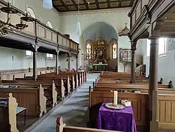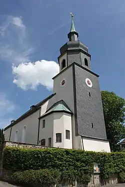 Die Ursprünge der Kirche liegen in einem Kapellenbau. Nach der Zerstörung im Dreißigjährigen Krieg erfolgte ein schrittweiser Wiederaufbau. Zur Datierung dieses Wiederaufbaus weisen Daten an einer Empore auf die Jahre 1659 und 1699 hin.[1] Der Hofer Bildhauer Johann Nikolaus Knoll fertigte um das Jahr 1700 einen nicht mehr vorhandenen Taufengel[2] und ein Holzkruzifix. Bei einer umfassenden Umgestaltung im Jahre 1899 wurde das Langhaus der Kirche nach Osten erweitert und ein neuer Chorraum angefügt sowie diverse Ausstattungselemente umgestaltet.[3] Kirche und Pfarrhaus sind Baudenkmäler des Ortes.