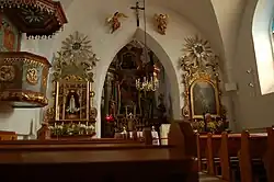 Der Hochaltar aus 1745 ist ein Säulenretabel, leicht geschwungen mit einem vorgestellten Säulenpaar, mit einem verkröpften Gesims und Opfergangsportalen mit großen Engelsfiguren. Das Hochaltarblatt hl. Jakobus der Ältere malte Josef Keßler (1881) und trägt eine Renovierungsnennung mit 1908. Der Auszug zeigt das Bild hl. Johannes Nepomuk mit zwei Engeln. Der Altar trägt flankierend die Statuen Florian und Donatus und seitlich des Auszuges die Statuen Johannes Evangelist und Antonius von Padua. Die Gnadenmadonna als barocke Kopie stammt aus Wien-Döbling. Die Orgel aus 1895 mit 10 Registern stammt von Albert Mauracher.[1]