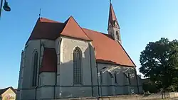 Die Kirche steht am südlichen Ende der Hauptstraße am Kirchenplatz in einem ummauerten Kirchhof, welcher bis 1788 als Friedhof diente. Der hohe pseudobasilikale Kirchenbau mit einem Querhaus und einem eingezogenen Chorpolygon hat einen westlichen eingestellten schlanken Fassadenturm.