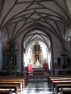 Im Langhaus ruht ein Netzrippengewölbe mit Wappenschlusssteinen auf Wandpfeilern mit Kehlung und Rundvorlage. Das Westjoch besitzt ein Tonnengewölbe mit Stichkappen. Die Orgelempore steht auf vier Pfeilern und schwingt im Mittelteil vor. Die breiten Spitzbogenfenster des Langhauses wurden erneuert. Ein spitzbogiger, abgefaster Triumphbogen verbindet das Langhaus mit dem eingezogenen Chor. Im Chor erhebt sich ein Kreuzrippengewölbe auf Konsolen. An der Chornordseite befindet sich das spitzbogige, abgefaste Sakristeiportal. An der Südseite gibt es ein erneuertes Korbbogenportal und darüber an beiden Chorwänden niedrige Oratorienfenster.