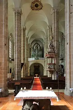 Nach 69-jähriger Bauzeit war die Kirche im Jahr 1523 fertiggestellt. Sechs Jahre später, im Jahr 1529, wurde sie im Osmanenkrieg niedergebrannt. Aus der Zeit vor der Zerstörung sind, außer Mauern und Säulen, das Sakramentshäuschen, der Kopf des Gekreuzigten am großen Kreuz und ein gesticktes Marienbild (heute beim Votivaltar) erhalten geblieben.