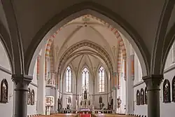 Das weiträumige dreijochige Langhaus ist mit Stichkappen und einer Rippenfiguration nach der Art des Early English mit durchlaufender Scheitelrippe eingewölbt. Einheitliche hohe zweibahnige, an den Querhausfronten vierbahnige Spitzbogenfenster mit feinem Maßwerk erhellen das Innere. In der Turmhalle stehen seit 1983 mehrere Epitaphien aus Adneter oder Untersberger Marmor, darunter ein figurales Epitaph für Melchior Reisacheder mit einer Darstellung der Anbetung der Könige von 1598, sowie weitere aus dem 16. Jahrhundert.