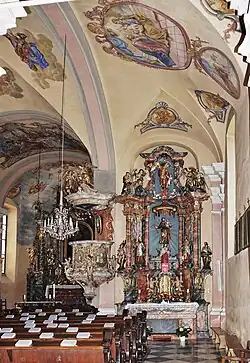 Das Altarbild des barocken Hochaltars mit Opfergangsportalen zeigt den Sturz Lucifers durch den Erzengel Michael. Assistenzfiguren sind links Johannes der Täufer und der Apostel Petrus, rechts die Apostel Paulus und Andreas. Die Figurengruppe im Aufsatz stellt die Marienkrönung dar. Der Altar geht optisch in die Ausmalung der Apsis über.