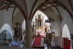 Der frühbarocke Hochaltar wurde um 1660 angefertigt und hat ein Säulenretabel mit Opfergangsportalen und Knorpelwerkdekor. In seiner rundbogigen Mittelnische steht eine 1375 geschaffene, annähernd lebensgroße, bekrönte Figur der Maria mit Kind. Das Auszugsbild Hl. Dreifaltigkeit wurde im 18. Jahrhundert gemalt. Über den reich ornamentierten Opfergangsportalen stehen Statuen der Hll. Augustinus und Nikolaus. Das Antependium ist reich verziert und trägt ein Marienmonogramm. Links und rechts steht je ein Leuchterengel aus dem 18. Jahrhundert. Das Speisegitter stammt aus der zweiten Hälfte des 17. Jahrhunderts. Die beiden Seitenaltäre haben jeweils ein barockes Säulenretabel aus dem vierten Viertel des 17. Jahrhunderts mit hohem Auszug. Am linken Altarbild, das von Statuetten der Hll. Florian und Josef flankiert wird, ist der hl. Sebastian zu sehen. Das Oberbild ist eine Darstellung des Mariahilf-Motivs. Der rechte Altar hat ein Bild des hl. Antonius Eremita und ein Oberbild des hl. Johannes Nepomuk.