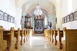 Das Langhaus der Kirche ist dreijochig und kreuzgewölbt. Das Gewölbe ruht auf kräftigen, pilastergegliederten Wandpfeilern. Zwischen den Gewölben sind Gurtbögen. Das Heiliggeistloch ist profiliert. Zwischen Chor und Langhaus befindet sich ein schmäleres Übergangsjoch mit querschiffartigen Wandnischen. Die Orgelempore ist dreiteilig und ruht auf Pfeilern. Sie wird von Platzgewölbe unterwölbt. Dazwischen sind Gurtbögen. Die Mitte der Brüstung ist leicht vorgezogen und weist leichten Dekor auf. Der zweijochige Chor ist leicht eingezogen und schließt im 3/8-Schluss. Über dem Chorraum ist Tonnengewölbe mit Stichkappen, das auf Pilastern mit reich profilierten Gebälkstücken ruht. Im südlich liegenden Turmerdgeschoß befindet sich die Sakristei. Der Raum ist kreuzgewölbt. Die dekorative Glasfensterausstattung stammt aus dem Jahr 1896.[1]