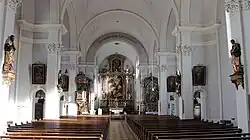 Das vierjochige Langhaus unter einem Tonnengewölbe mit Stichkappen mit einer Orgelempore im Westen hat weit in den Raum hineinstehende seitliche Pfeiler mit rundbogigen Durchgängen. Hinter dem rundbogigen Triumphbogen schließt der einjochige kreuzgratgewölbte Chor an.