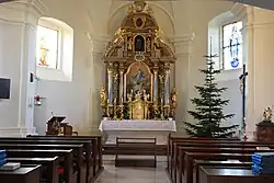 Der Hochaltar entstand in der zweiten Hälfte des 17. Jahrhunderts. Zwischen je zwei korinthischen Säulen befindet sich eine Nische, in der sich eine Madonna mit Kind befindet. Der Aufsatz ist mit Rundgiebel und Säulen verziert. Unten und oben sind Heiligenfiguren, im Aufsatz Gott Vater mit Putti.