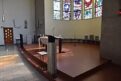 Der schlichte Kirchenbau mit einem Langhaus unter einem Satteldach hat hohe Rechteckfenster. Das große Glasfenster im halbkreisförmigen Chor mit der Krönung Mariens, Szenen aus den Rosenkranzgeheimnissen und der Darstellung europäischer Marienwallfahrtsorte malte 1961 der Maler Albert Birkle.