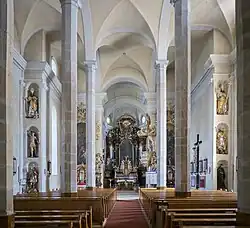 An das dreischiffige fünfjochige Langhaus als Hallenkirche schließt ein eingezogener dreijochiger stichkappentonnengewölbter Chor mit einem Dreiachtelschluss an. Das weiträumige Langhaus mit hohen achteckigen Pfeilern hat niedrige Gratgewölbe, was gotisch wie eine Störung empfunden werden kann. Das östliche Joch der beiden Seitenschiffe sind schmäler, weshalb diese Einengung des Langhauses die Wirkung eines Vorchores macht, wobei die Rücksprünge mit drei übereinander situierten Statuennischen eine besondere Wirkung erzeugen. Die dreiachsige Westempore ist kreuzgratunterwölbt. Der Turm an der Südseite des östlichen Langhausjoches trägt einen Zwiebelhelm. Am dritten Joch des nördlichen Seitenschiffes steht die Kreuzkapelle mit einem langelliptischen Grundriss mit drei gedrückten Konchen und einer tambourlosen Kuppel mit Laterne und einem Abschlussgitter.