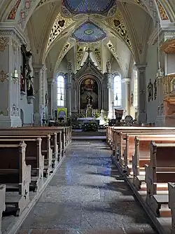 Das Kircheninnere zeigt ein Langhaus mit der Barockisierung von 1718, die gotischen Runddienste sind durch Wandpfeiler ersetzt, die Rippen des Netzrippengewölbes sind abgeschlagen. Die zweigeschoßige Westempore hat eine geschwungene Brüstung. Der einjochige Chor mit einem Fünfachtelschluss hat ein Sternrippengewölbe mit abgeschlagenen Rippen, hinter dem Hochaltar sind beim Achsenfenster zwei gotische Runddienste erhalten, sonst sind die Runddienste durch barocke Wandpfeiler ersetzt. In der Südwand des Chores ist der Zugang zur Sakristei als ehemalige Michaelskapelle, der Raum ist kreuzrippengewölbt mit ringförmigen Schlusssteinen und es gibt weiters eine kreuzgratgewölbte Unterkirche.