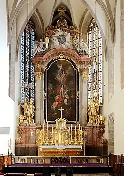 Der Hochaltar stammt aus den Jahren 1761 und 1762. Er ist eine monumentale, pilastergegliederte Bildrahmenretabel auf einem hohen, volutenflankierten Sockel. Das Altarbild von Johann Panter zeigt die „Mantelspende des heiligen Martin“. Es wurde um 1760 geschaffen und 1846 renoviert. Am kartuschenförmigen Volutenauszug sind Engelsfiguren mit Attributen des heiligen Martin von Tours. Seitlich des Altarbildes sind Figuren der Heiligen Florian und Leopold. Der Altartisch ist als Sarkophagaltar mit monumentalem, reich gegliedertem Rokoko-Tabernakel ausgeführt. Die vier Konsolstatuen im Chor wurden 1895 geweiht. Sie stellen den heiligen Josef, den heiligen Jakobus, den heiligen Antonius sowie die heilige Anna dar.