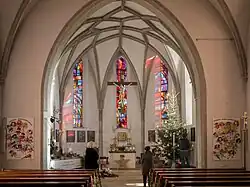 Das dreijochige Kirchenschiff ist einschiffig. Darüber ist Kreuzrippengewölbe. Der zweijochige Chor ist netzrippengewölbt und endet im 3/8-Schluss. Das Gewölbe lagert auf gotischen, halbrunden Diensten.