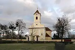 Das Gebäude ist eine spätbarocke Saalkirche mit Strebepfeilern an den Außenwänden. Es ist teile von ehemaligen Friedhofsmauer umgeben.