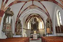 Über den beiden östlichen Jochen des dreijochigen Langhauses erhebt sich ein Sternrippengewölbe über tief herabgezogenen, abgekragten Diensten. Das Westjoch hat ein Gratgewölbe. An der Nordwand des Langhauses stellt ein spätgotisches Freskofragment die Flucht nach Ägypten dar. Der barockisierte, pilastergegliederte Triumphbogen verbindet das Langhaus mit dem Chor. Im Chor ruht ein Kreuzrippengewölbe auf halbrunden Vorlagen, die von einem Sohlbankgesims aufsteigen. Eine spitzbogige Tür an der Südwand des Chores führt in die Sakristei. Darüber befindet sich der rundbogige Zugang zum Turm. Die Kirchenfenster wurden barock umgestaltet.
