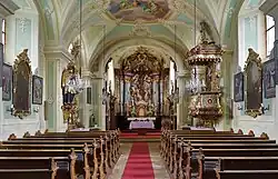 Das Kircheninnere zeigt ein tonnengewölbtes Turmerdgeschoß. Das Langhaus als dreijochiger Wandpfeilerraum ist von einer korbbogigen Stichkappentonne überwölbt und durch kräftige Pilaster sowie mit einer profilierten Stichkappentonne gegliedert, die Segmentbogenfenster befinden sich in tiefen Nischen. Die Westempore hat einen Orgelerker. Der korbbogige Triumphbogen ist eingezogen. Der einjochige platzlgewölbte Chor hat beidseits Öffnungen mit von Pilastern und Volutenkonsolen getragenem reich profilierten Gebälk und darüber Namenskartuschen und Büsten der Heiligen Petrus und Paulus aus der Mitte des 18. Jahrhunderts, die Öffnungen führen rechts in die Sakristei und links in das Oratorium.