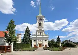 Die klassizistische dreiachsige Westfassade von 1780 wurde laut einer Inschrift im Jahr 1816 wiederhergestellt. Mittig befindet sich ein dreigeschoßiger Fassadenturm mit einem Obeliskendach aus dem Anfang des 19. Jahrhunderts. Das Erdgeschoß ist durch toskanische Pilaster gegliedert, darüber befindet sich eine Giebelädikula zwischen Schmiegen mit einem Vasenaufsatz.