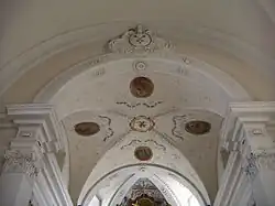 Die Kirche besteht aus einem weiträumigen Hauptschiff, schmalen Seitenschiffen und einem breiten Querschiff. Das tonnengewölbte Hauptschiff wird im westlichen Teil durch Gurtbögen in drei Joche geteilt. Jedes Joch hat auf beiden Seiten je ein Segmentbogenfenster im Obergaden. Östlich schließt ein weiteres, deutlich tiefer gebildetes Joch an, das sich zu den fast gleich hohen tonnengewölbten Querarmen öffnet. Über den Seitenschiffen, die ihr Licht über je sechs Segmentbogenfenster erhalten, befinden sich Seitenemporen mit Quertonnengewölben und Balustraden. Seitenfenster sorgen für die Belichtung des Querschiffes.