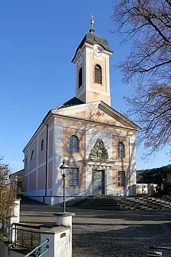 Sie befindet sich im Südosten des Ortes auf einer Terrainstufe. Südlich schließt der Friedhof an und nördlich, am Fuß des Kirchenhügels, befindet sich der barocke Pfarrhof, der 1785 errichtet wurde.[1]