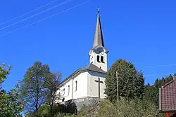 Die von einem Friedhof mit Mauer umgebene Kirche steht auf einer Anhöhe über dem Ort. Der spätklassizistischer Bau aus dem Jahre 1850 hat ein vierjochiges Langhaus und einen leicht eingezogenen Chor mit Dreiachtelschluss. Der Turm an der Nordseite mit Mauerschlitzen und rundbogigen Schallfenstern wird von einem im 20. Jahrhundert errichteten Spitzhelm bekrönt. Im Turmerdgeschoß ist ein gotisches Gewölbe vom Vorgängerbau erhalten. Zwischen Turm und Chor befindet sich ein hoher Sakristeianbau. Die Kirchenfassade wird von einem Mäanderfries, Lisenen und Rundbogenfenstern gegliedert. Das Westportal ist mit schlicht verzierten Metallplatten beschlagen. Das Portalblatt des Vorgängerbaues verschließt jetzt den Zugang zur Totenkammer.