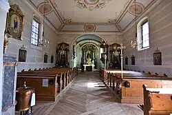 Das Kircheninnere zeigt ein Langhaus unter einem Spiegelgewölbe, der eingezogene einjochige Chor hat einen halbrunden Schluss.