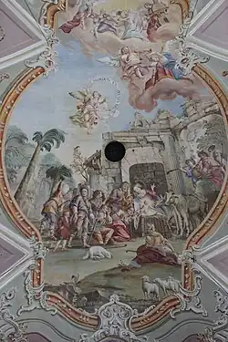 Das vierjochige tonnengewölbte Langhaus mit einem gleich breiten zweijochigen Chor mit einem Dreiachtelschluss hat Rundbogenfenster. Bemerkenswert ist die barocke Decken- und Wandmalerei von Josef Anton Puellacher.